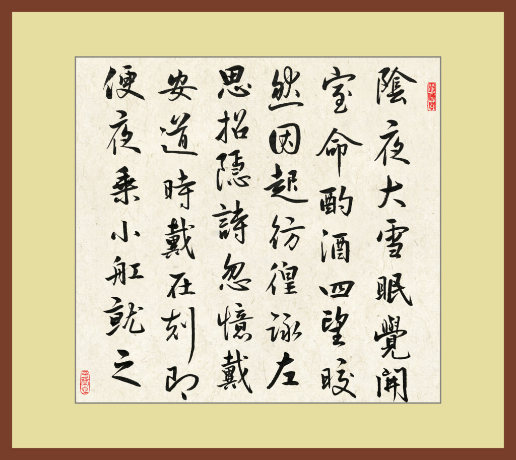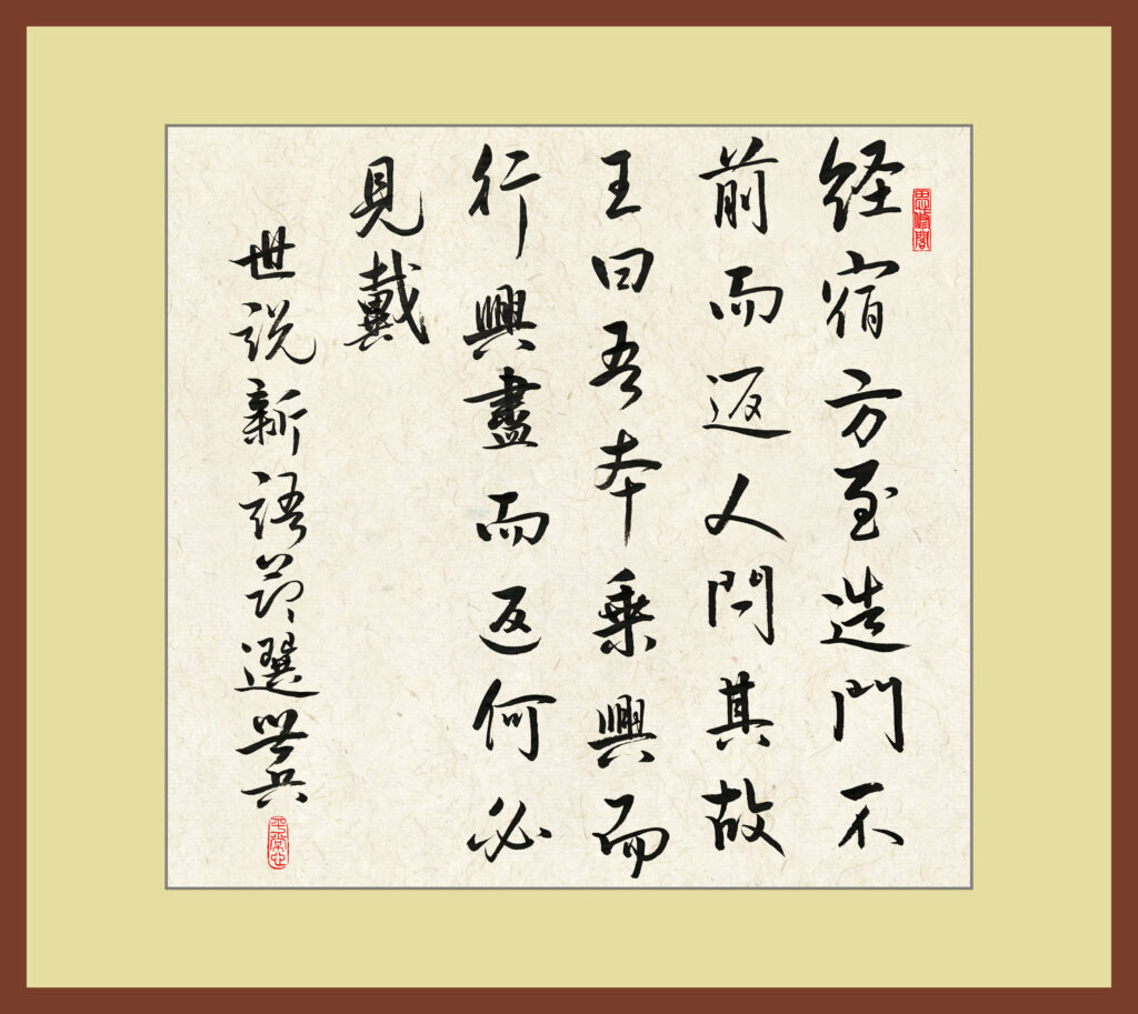 王子猷居山阴,夜大雪,眠觉,开室,命酌酒,四望皎然。因起彷徨,咏左思《招隐》诗。忽忆戴安道。时戴在剡,即便夜乘小舟就之。经宿方至,造门不前而返。人问其故,王曰:“吾本乘兴而行,兴尽而返,何必见戴?”