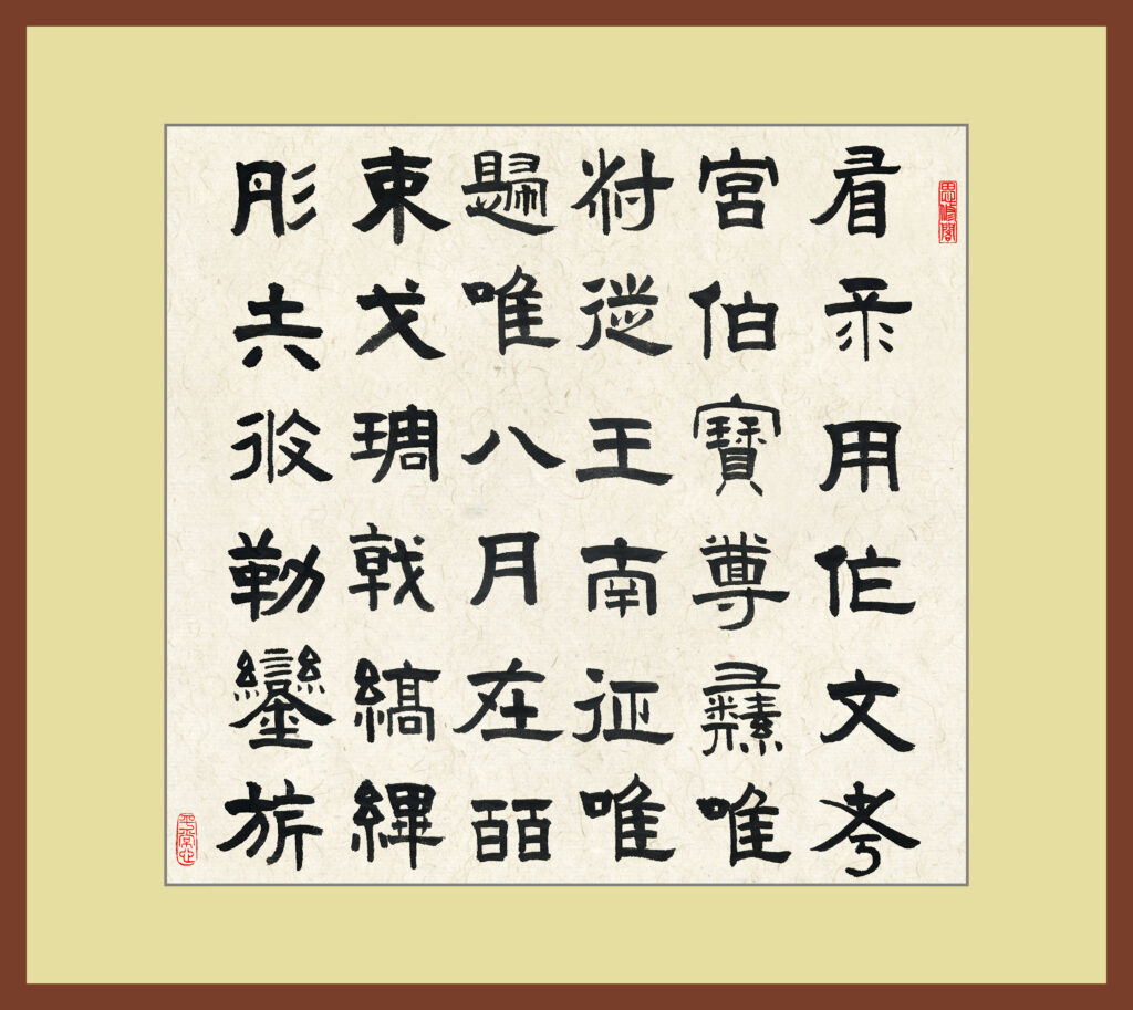 眉乘录用作文考宫伯寶尊彞。唯叔从王南征,唯歸。唯八月,在皕敕戈琱,戟、彤矢、攸勒、鑾、旂。