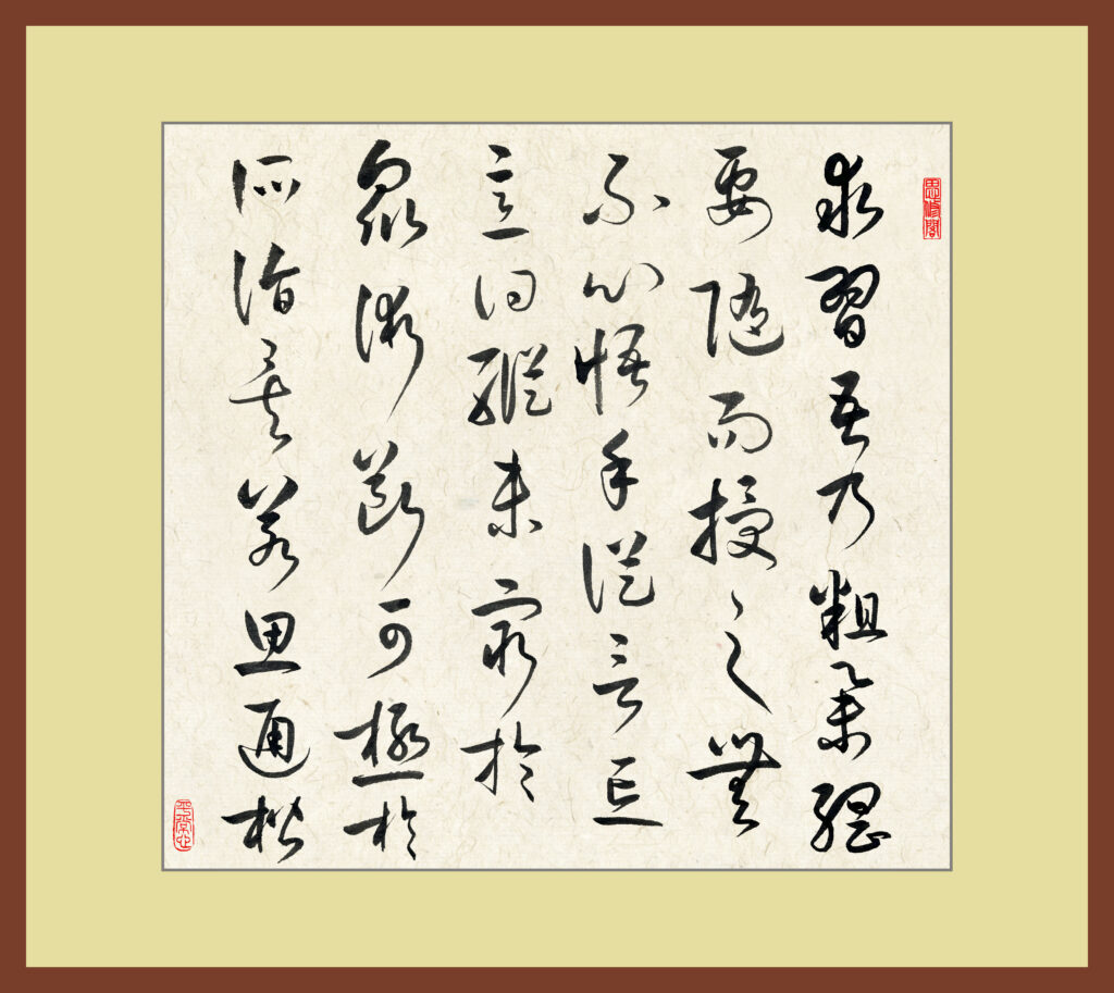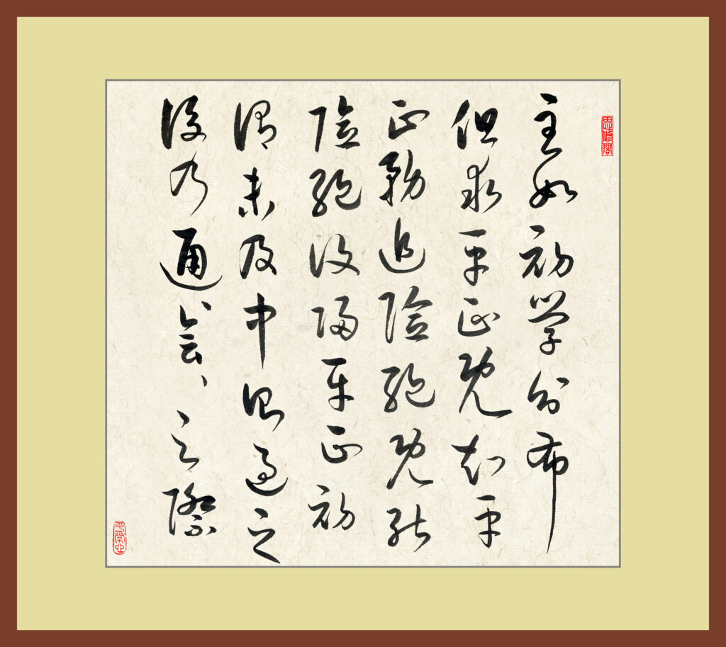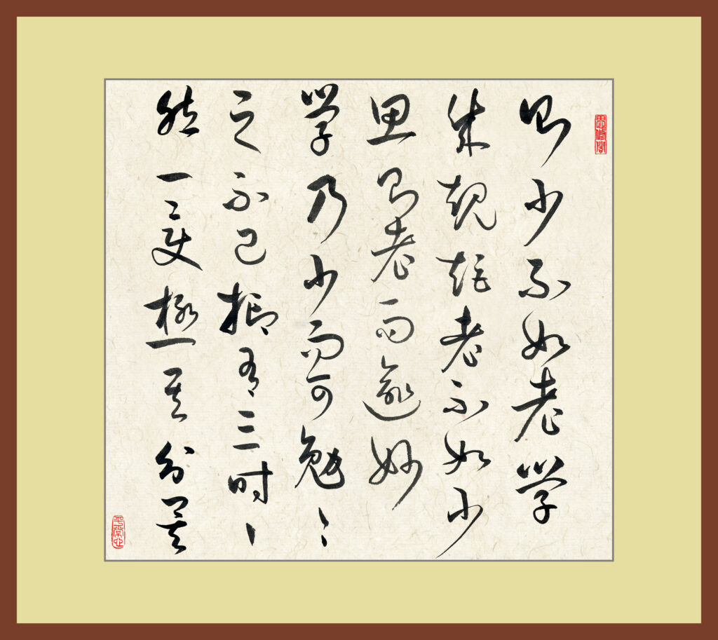 post 478, 2025-11-6 书谱 7 Leave a Comment / blog / By marshj 求习,吾乃粗举纲要,随而授之,无不心悟手从,言忘意得,纵未穷于众术,断可极于所诣矣。 若思通楷则,少不如老;学成规矩,老不如少。思则老而愈妙,学乃少而可勉。勉之不已,抑有三时;时然一变,极其分矣。至如初学分布,但求平正;既知平正,务追险绝,既能险绝,复归平正。初谓未及,中则过之,后乃通会。通会之际,人书俱老。仲尼云:“五十知命”、“七十从心”。故以达夷险之情,体权变之道,亦犹谋而后动,动不失宜;时然后言,言必中理矣。 是以右军之书,末年多妙,当缘思虑通审,志气和平,不激不厉,而风规自远。子敬已下,莫不鼓努为力,标置成体,岂独工用不侔,亦乃神情悬隔者也。或有鄙其所作,或乃矜其所运。自矜者将穷性域,绝于诱进之途;自鄙者尚屈情涯,必有可通之理。嗟乎,盖有学而不能,未有不学而能者也。考之即事,断可明焉。然消息多方,性情不一,乍刚柔以合体,忽劳逸而分躯。或恬憺雍容,内涵筋骨;或折挫槎枿,外曜锋芒。察之者尚精,拟之者贵似。况拟不能似,察不能精,分布犹疏,形骸未检;跃泉之态,未睹其妍,窥井之谈,