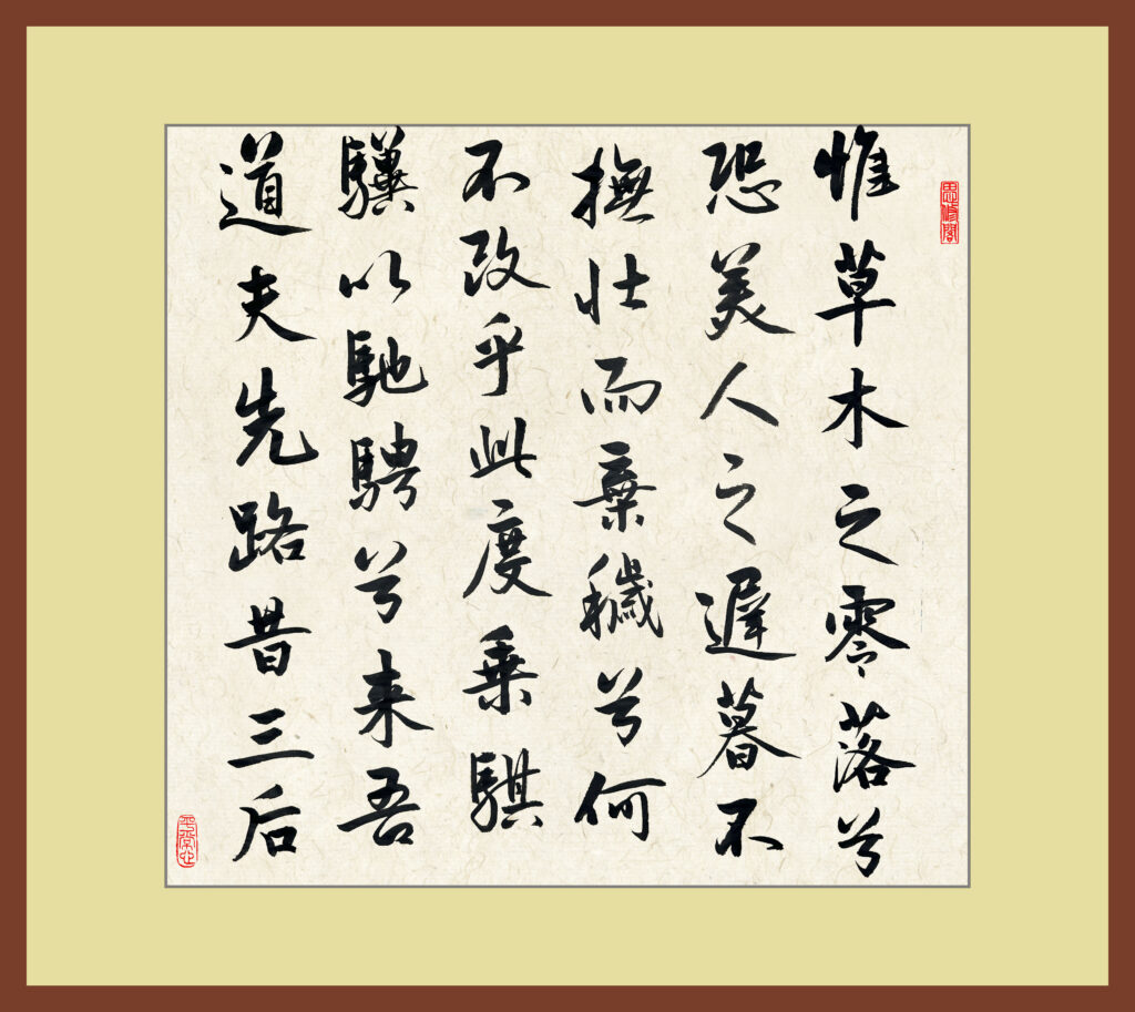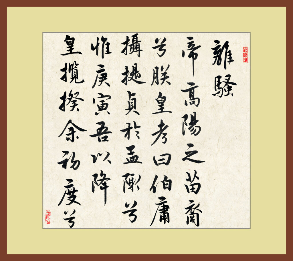 post 481, 2025-11-9 离骚 1 Leave a Comment / blog / By marshj 帝高阳之苗裔兮,朕皇考曰伯庸。摄提贞于孟陬兮,惟庚寅吾以降。皇览揆余初度兮,肇锡余以嘉名。名余曰正则兮,字余曰灵均。纷吾既有此内美兮,又重之以修能。扈江离与辟芷兮,纫秋兰以为佩。汩余若将不及兮,恐年岁之不吾与。朝搴阰之木兰兮,夕揽洲之宿莽。日月忽其不淹兮,春与秋其代序。惟草木之零落兮,恐美人之迟暮。不抚壮而弃秽兮,何不改此度?乘骐骥以驰骋兮,来吾道夫先路!昔三后(之纯粹兮,固众芳之所在。)